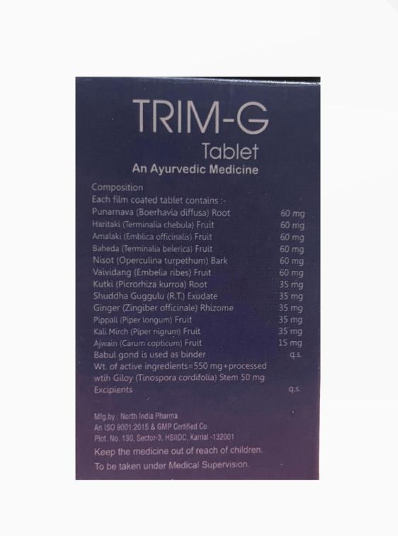 Trim-G Tablets are an Ayurvedic herbal formulation designed to support natural weight management and promote a healthy metabolism. Enriched with traditional fat-metabolizing herbs, this formula assists the body in improving digestion, enhancing fat breakdown, and maintaining overall fitness.